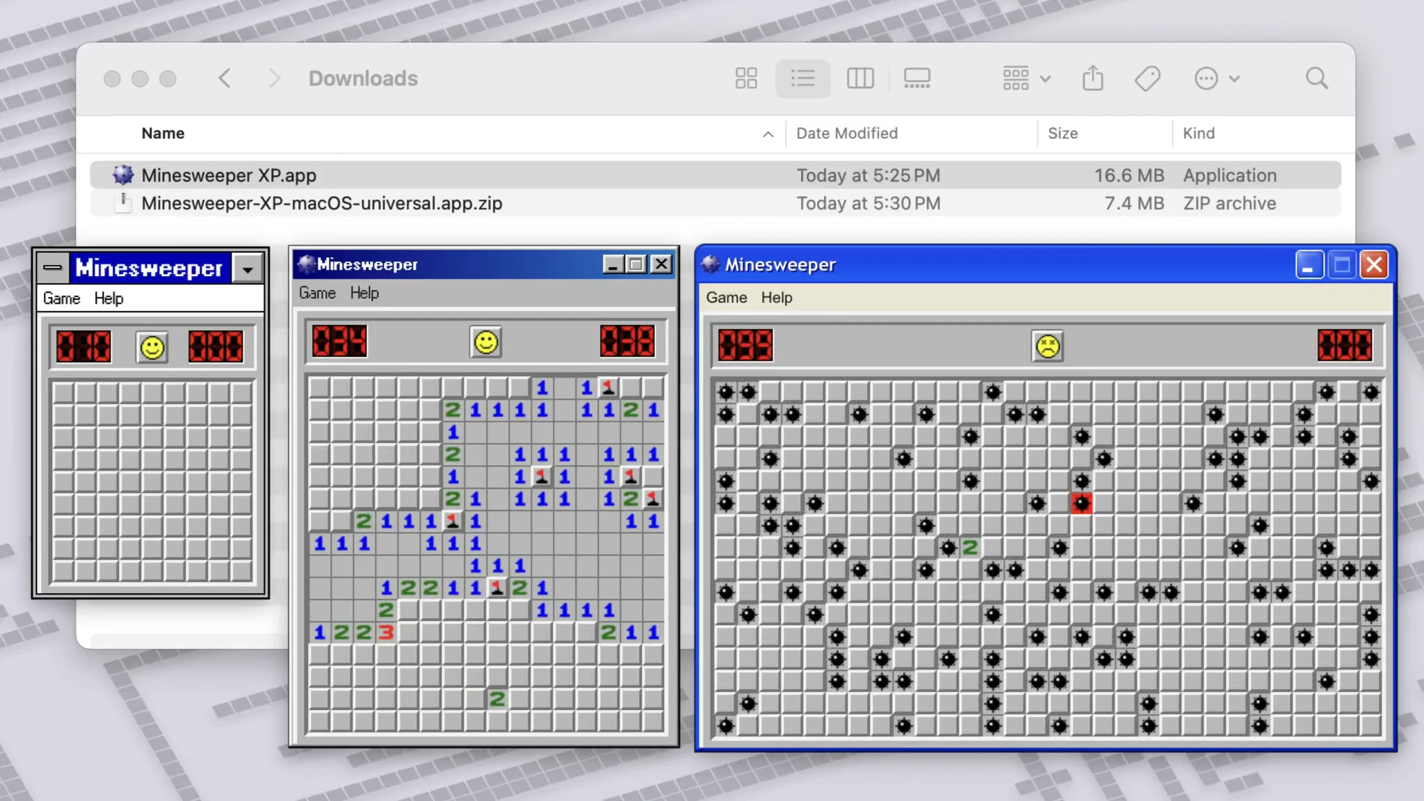 CommunityShowcaseMinesweeper XPバージョン: v2.11.0Minesweeper XP Minesweeper-XP allows you to experience the classic Minesweeper XP (+ 98 and 3.1) on macOS, Windows, and Linux!