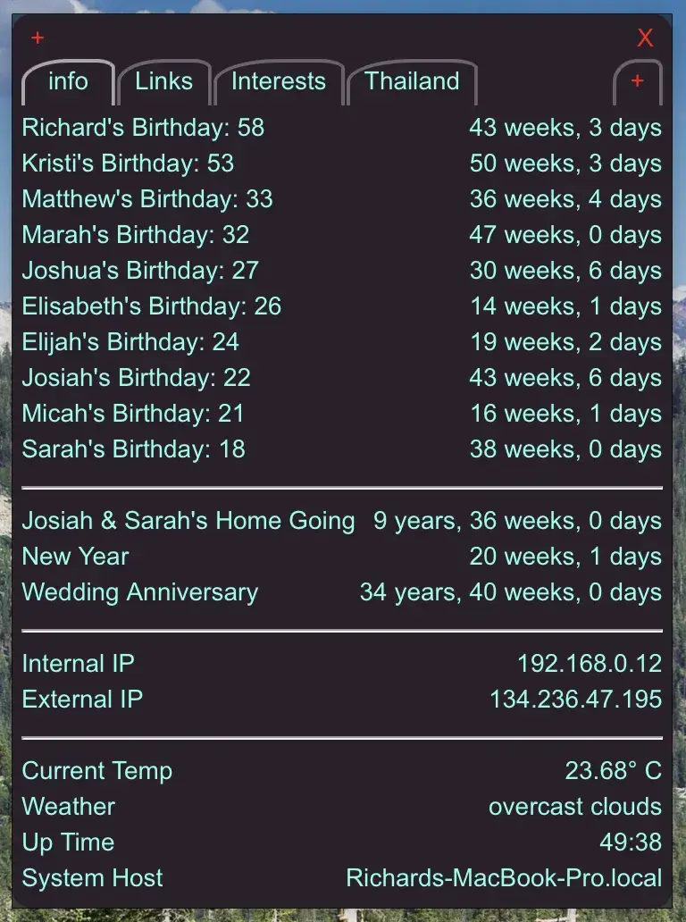 ScriptBar is a program to show the output of scripts or Node-Red server. It runs scripts defined in EmailIt program and shows the output. Scripts from xBar or TextBar can be used, but currently on the TextBar scripts work well. It also displays the output of scripts on your system. ScriptBar doesn't put them in the menubar, but has them all in a convient window for easy viewing. You can have multiple tabs to have many different things show. You can also keep the links to your most visited web sites.
